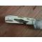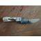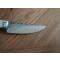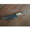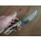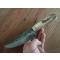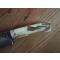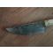 couteau forgé en acier carbone, émouture plate, trempe à l'huile. Montage en plate de semelle, manche en plaquettes de résine avec inclusions d'ivoire fossile de mammouth. Etui en cuir.