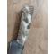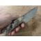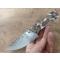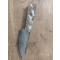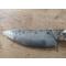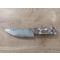 couteau forgé en acier carbone, émouture creuse, trempe à l'huile. Montage en plate de semelle, manche en plaquettes de résine avec inclusions de plumes de bécasses. Etui en cuir.