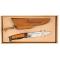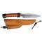 Couteau outdoor ou de chasse Wildsteer avec pierre à feu Il présente une lame en acier inoxydable Z50Cd13 d'une dureté de 54-55HRC, pourvu d'un tranchant principal pour coupe rondin à l'extrémité d'un tranchant rasoir pour coupes fine et d'une pointe Tanto pour inciser. Le dos est pourvu de crans pour ébavurages Manche et étui en cuir de couleur or (Gold) avec pommeau de frappe en acier inoxydable Longueur lame : 11,5 cm Longueur totale : 26 cm. Epaisseur de lame : 4.5 mm à la pointe et 7.5 mm sous les crans Poids : 280g Compatible pince-coupante ou extracteur de flèche, il est muni d'un berceau pour pince et d'un point d'encrage pour extracteur (accessoires non fournis) Made in France