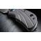 Les plaquettes du manche sont en G10 noir texturé, des fraisages décoratifs et l' anneau bleu autour de la vis de l'axe lui donnent un bel aspect visuel.