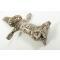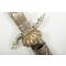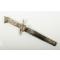 Avec lame à double tranchant de 17,5 cm à pointe en forme de lance, garde coquille et paire de quillons opposés en métal argenté, terminés par des sabots fendus. La poignée moulée est ornée de trophées d’armes de chasse, avec un pommeau en tête de sanglier. Le tout est contenu dans son fourreau d’origine partiellement gainé de cuir, avec garnitures assorties décorées de trophées similaires d’armes et d’équipements de chasse.