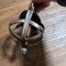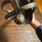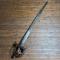Pommeau rond proéminent à côtes entre deux etoiles à 8 branches en laiton , fusée en bois fêle sans aucun jeu , garde panier en fer forgé qui enveloppe et protège entièrement branches montée en queue d'arronde, une légèrement décalée, aucun jeu ,