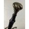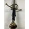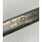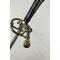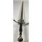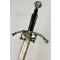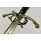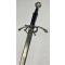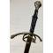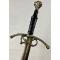 Épée gothique à croix, lame signée, forgée à Schlangen (Allemagne) en 1502. La lame porte également une marque chrétienne. De grande taille (122 cm), elle présente une garde robuste et allongée avec une boucle pointue en dessous, une longue poignée permettant une utilisation ambidextre et un pommeau imposant et orné. La lame est à un seul tranchant, avec un double tranchant et une légère échancrure centrale à la base.