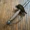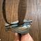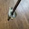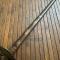 Monture bronze, garde à une branche, plateau fixe en forme de lyre asymétrique pourtour cannelé , palmette , pommeau ovale décoré au trait , fuseee bois entièrement recouverte d'un double filigrane cuivre en chevron tressé et baguée aux extrémités .