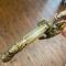 EPEE d'OFFICIER, monture en bronze doré. Arc de jointure ciselé en son milieu d'un masque léonin et trèfle . Fusée de nacre naturelle cannelée aux beaux reflets . Clavier ovalaire à décor de coq dans une courronne de laurier entouré de cornes d'abondances et deux têtes de lions de profilt, Quillon en fleur. Lame droite triangulaire à décor de trophées gravés au tiers, lame de SOLINGEN signée à sa base L.K.F ?
