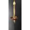 Monture en bronze doré dite "des Gardes Françaises", pommeau en olive surmonté d'un bouton de rivure, arc de jointure et quillons unis, fusée quadrangulaire totalement filigranée, plateau échancré en avant et orné d'une palmette en arrière. Lame droite à méplat médian, double tranchant, longue 79cm, gravure décorative autour d'un soleil rayonnant sur chaque face sur fond bleui doré, fines taches sans corrosion. Fourreau en cuir noirci et verni à deux fines garnitures en laiton doré, chape à anneau de suspente, usure d'une partie de la couture sans fragilisation. Longueur totale 96cm