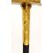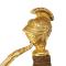 Monture en bronze doré très finement ciselée, garde à une branche décorée d'une étoile encadrée de branches de laurier avec en partie haute une tête de monstre mythologique. Croisière finement ciselée, noeud de corps au visage rayonnant, quillon droit aux faisceaux de licteurs à têtes de lions aux extrémités. Pommeau en forme de casque empanaché à l'antique. Viroles en laiton décorées de feuilles de chêne. Poignée en bois entièrement filigrané de cuivre anciennement doré. Clavier bivalve décoré d'une tête d'Hercule casqué, d'étoiles, de branches de laurier, de feuilles d'acanthe et d'une grande palmette, entrée de cuvette fixée en dessous. Lame à deux pans avec méplat central, longueur 80cm, gravée de trophées militaires, de soleil rayonnant et de décors floraux sur sa première moitié avec décors bleui doré. Fourreau en cuir verni noir, légère usure sans accident, chape en laiton doré a décors repoussé finement gravé de toile d'araignée et feuillage, bouterolle décorée en suite et terminée par un dard en forme de coquille Saint-Jacques.