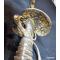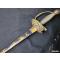 Épée à lame droite de section triangulaire, gravée bleuie et dorée au tiers de trophées et motifs floraux garde en acier richement sculptée de trophées et de motifs floraux en ronde-bosse sur fond doré ; fusée filigranée d'argent (rares petits manques).
