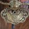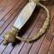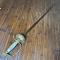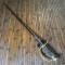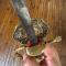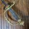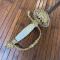 Monture en laiton ciselé, clavier ajouré au armoiries du Pérou sur fond d'étendard , plaquette en nacre, il en manque une (vous en trouverez sur internet autant en original quand reproduction en véritable nacre) cravate en tissu rouge , lame triangulaire à pans creux léger coup en bout facilement récupérable.