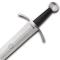 Cette épée, qui pourrait avoir été portée au début de la guerre de Cent Ans, présente plusieurs caractéristiques très distinctives. La garde transversale s'incurve subtilement vers la lame, se rétrécit et se renfle aux extrémités. Le pommeau caractéristique présente des angles et des faces très distinctifs. La poignée repose très confortablement dans la main. La lame large et droite présente une section diamantée aplatie, à double tranchant, avec un canal étroit pour réduire le poids. Elle s'élargit légèrement au niveau de la poignée et les bords élégamment courbés se terminent par une pointe acérée. L'épée est assez légère pour sa taille, mais elle offre une grande présence de la lame et une grande puissance dans la main.