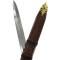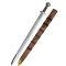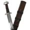 Le fourreau en bois et cuir souple brun, tressé de cuir noir et orné d'entrelacs en métal doré, met en valeur la noblesse de la lame. Son attache porte-épée en bois et cuir permet un port à la ceinture à la manière des guerriers celtes. La poignée gainée de cuir brun assure une prise ferme et confortable, tandis que le pommeau en acier poliéquilibre parfaitement l'ensemble.
