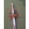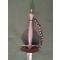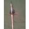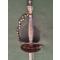 Épée de court européenne du XVIIIe siècle. Garde et poignée en acier finement travaillées et ciselées, d'une précision remarquable. Quilles horizontales. Elle est munie d'une sécurité composée d'un fil métallique suspendu à de petites billes, restaurée par un fil de fer. Lame triangulaire à décor légèrement usé, typique de la fin du XVIIIe siècle. Son extrémité est particulièrement fine.
