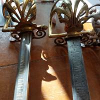 Intéressante et rare épée à la mousquetaire, sans doute des Pays Bas (il y a un exemplaire semblable à l Armeria de Turin et plusieursa la Wallace Collection), qui sent sa transition entre la rapiere et la future épée de cour. Elle est lourde, avec des meplats large, une lame d’epee de guerre ou de ville très robuste. On retrouve ce même modèle de personnage féminin sur la branche de jointure et monture fer sur des épées néerlandaises des années 1650-1660 (TOMAS, Bruno : Armi e Armature Europee - Bramante)