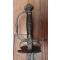 Généreuse monture fer à deux grand méplats repoussés et ciselés, large annelets fonctionnels, arc de jointure, pommeau en urne es deux également ciselées d un très riche et baroque décor de cavaliers, angelot, dragons , deux sortes de sirènes (sur le contre quillon et l arc de jointure), 2 têtes sur le coté du pommeau, une sorte de couronne de lauriers pour le passage de la lame.