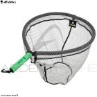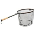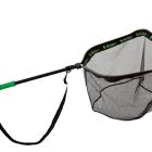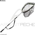 Il est repliable sur tous les modèles ce qui permet là aussi de gagner en compacité. Il est confectionné en aluminium anodisé de couleur grise. Une poignée en mousse EVA haute densité de couleur verte offre une bonne prise en main. Il suffit de tourner le manche deux fois de suite pour qu'il soit bien solidariser au cadre. Autre bonne idée une toise permettant de mesurer les poissons est gravée sur le manche ce qui permet de mesurer une prise dans le filet de l'épuisette, jusqu'à une taille de 70 cm.