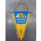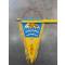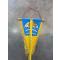 Ancien fanion triangulaire bleu et jaune avec franges dorées et cordon de suspension.
