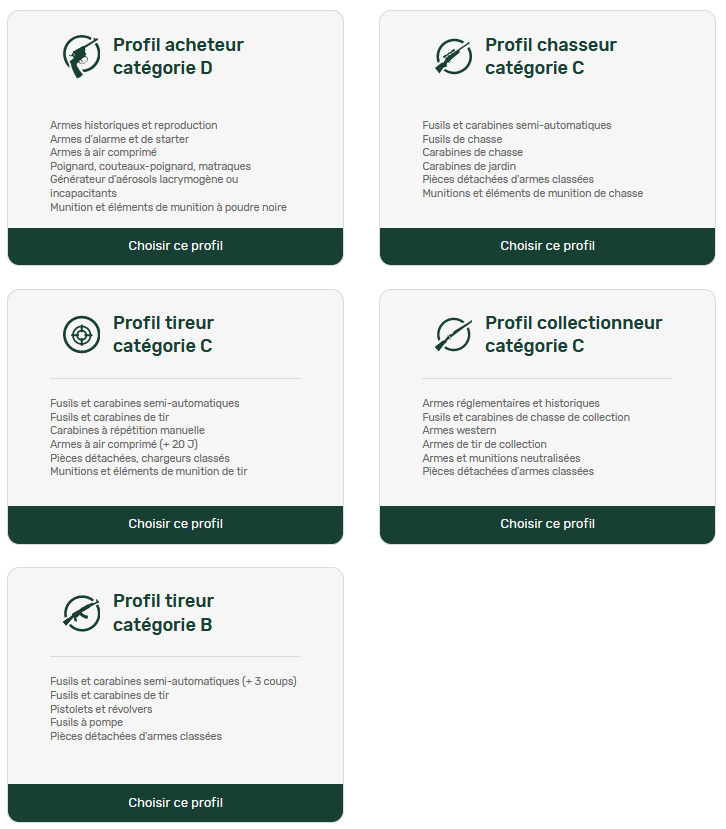 Pour l'achat d'armes ou de munitions, il est nécessaire de fournir plusieurs documents en fonction de la classification :