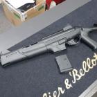Le long tube magasin en aluminium est de couleur noire, il est fixé au canon au moyen d'une belle entretoise en X rouge. Bravo le designer !