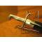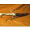 Fourreau a subit un choc visible derrière (en plus du manque vers la chape), eclat ou balle et la lame à l'endroit de la coupure du cuir a subi une tentative de coupure des deux côtés (comme cisaillé). il y a aussi une tentative vers la poignée??
