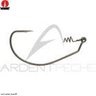C'est un modèle fabriqué en fil d'acier Vanadium très solide. Il est équipé d'un micro-ardillon. C'est un avantage car ce micro-ardillon ne freine pas la pénétration de la pointe dans la gueule du poisson mais retient plus la prise que les hameçons sans ardillons. La pointe bénéficie de la technologie Needle Sharp très piquante. La forme de cet hameçon est de type Technical Locking Curve avec arrondi un peu brisé et une pointe un peu rentrante. L'ouverture de l'hameçon est large, « Extra wide gap » afin d'améliorer le taux de capture lors des touches. Cest un hameçon dit inline c'est-à-dire dont l'œillet d'attache est dans le même sens que la forme de l'hameçon afin d'équiper des leurres durs de type poissons nageurs par exemple. Ainsi, une fois positionné sur l'anneau brisé l'hameçon sera bien dans le sens de la nage du leurre.