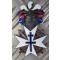Rare insigne de chevalier de la croix de Lorraine, ordre non officiel crée après 1945 pour honorer certains survivants de la résistance ayant bien mérité de la patrie! Hauteur 78 mm largeur 46 mm. splendide bijou émaillé d'une grande qualité! quelques éclats minimes à l'émail blanc du panache surmontant le heaume. Croix de malte blanche croix de Lorraine bleue, deux épées de feu brochant la croix, le tout surmonté d'un heaume empanaché de plumets tricolores. Epingle au dos!