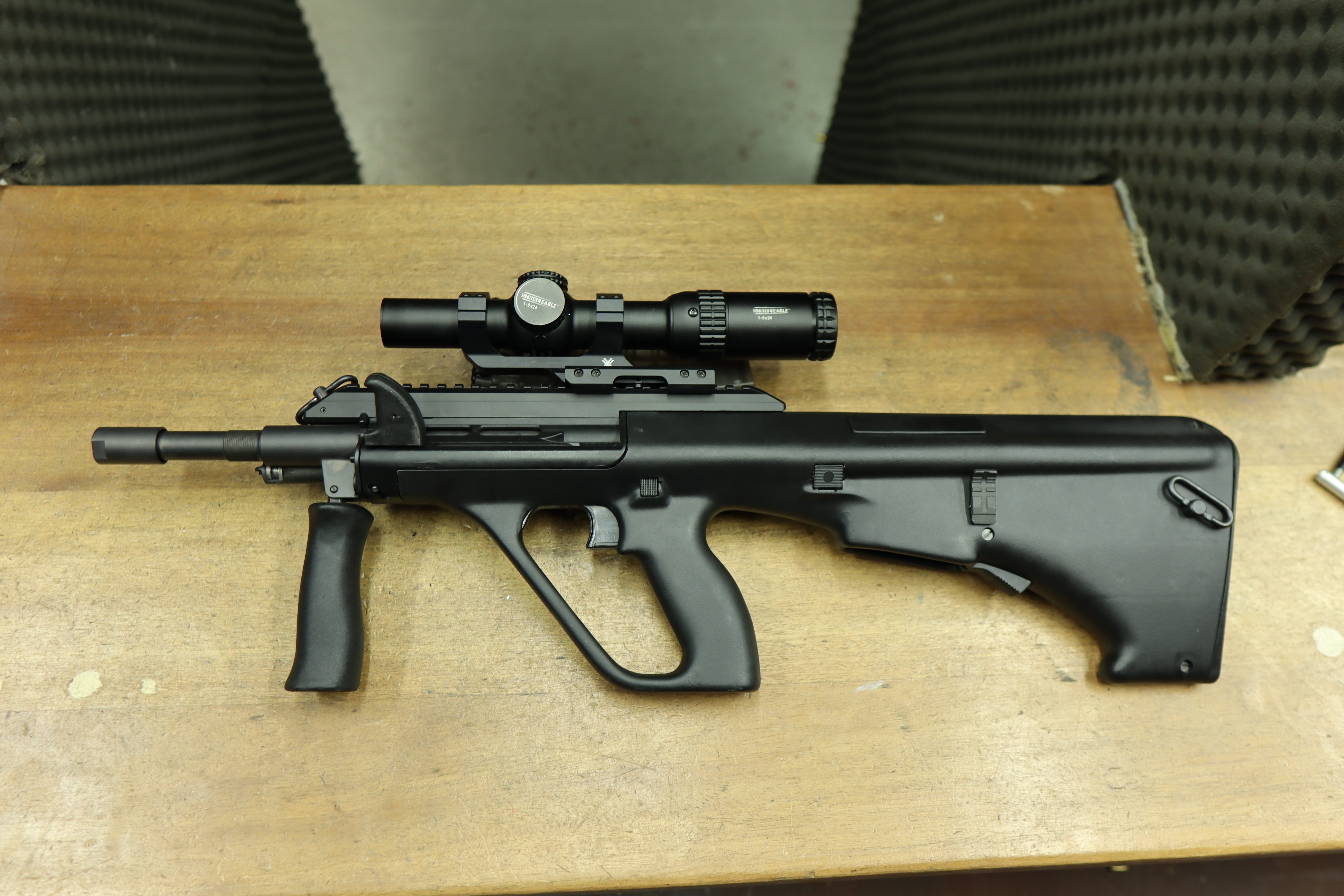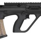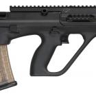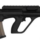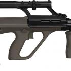 C’est en Autriche que le bullpup franchit un cap décisif. Le Steyr AUG, adopté en 1977, incarne tout ce que l’on associe encore aujourd’hui à l’esthétique bullpup : lignes futuristes, abondance de polymères, lunette intégrée. Chambré en 5,56×45 mm OTAN, il combine une compacité remarquable avec des performances balistiques équivalentes à celles des fusils d’assaut conventionnels.