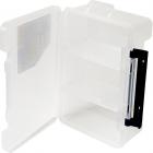 Cette boite est proposée en deux coloris, un blanc translucide pour bien voir les objets contenus et un brun plus opaque ménageant les leurres des effets du soleil.  Les dimensions extérieures sont de 275 mm de long X 187 mm de large X 43 mm de haut.