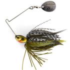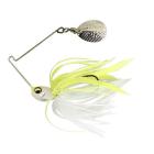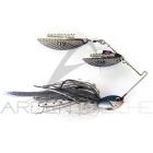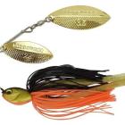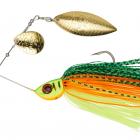 Leurre 4x4 par excellence, le spinnerbait qui n’a pas de traduction en français a été inventé en 1951 au Missouri. Il utilise l’attrait des palettes montées sur une armature pour faire réagir le poisson. Sa conception découle de l’adjonction d’une palette déportée sur une tête plombée agrémentée de filaments. La tête plombée est souvent peinte et de forme poisson pour le coté visuel, la jupe silicone donne du volume et apporte des vibrations douces alors que la ou les palettes envoient des flashs puissants dans l’eau. Le spinnerbait passe bien les obstacles puisqu’en nage son hameçon est orienté vers le haut. Deux types distincts cohabitent avec un modèle à simple palette colorado (ronde) destinée à pêcher les cassants en le laissant couler sans l’animer et un modèle à double palettes willow (lancéolée) destiné à une récupération plus linéaire en plein eau. Le spinnerbait est disponible en différentes tailles car il attire autant les perches que les gros brochets et les fabricants nous proposent régulièrement de nouveaux modèles.