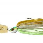 Chatterbait n’est pas un nom générique mais le nom d’un leurre mis en vente par ZMan, on le classe dans la famille des bladed jigs car il est composé d’un simple rubber jig auquel est adjoint une palette particulière orientée vers le haut. La pression de l’eau mettra en mouvement cette palette qui va se mettre à basculer latéralement en créant une vibration frénétique du jig et du leurre souple qu’on aura pris la peine d’installer en trailer. Le chatterbait est extrêmement efficace surtout en début de saison, comme il vibre beaucoup il demande l’usage d’une canne assez souple qui étouffera un peu les vibrations qui peuvent vite devenir désagréable dans le poignet. Les modèles les plus efficaces pour nos carnassiers sont le Boomer de Gunki, le Jack Hammer d’ Evergreen et le Wild header de Megabass.