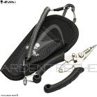 Cette pince à la finition remarquable et à l’usinage très précis saura se faire oublier à vos côtés grâce à sa construction aluminium qui la rend très légère tout en restant très solide. Les mors sont en acier inoxydable et sont visés sur le bâti, ceux – ci comprennent des empreintes classiques striées destinées à maintenir fermement n’importe quelle matière, des empreintes en relief et en creux pour sertir des sleeves, ainsi qu’un ergot pointu idéal pour ouvrir les anneaux brisés. On notera l’excellent usinage de ces mors avec une pointe parfaitement jointive qui facilitera l’ouverture des plus petits anneaux brisés. Cette pince est aussi classiquement équipée d’un coupe fil sur le coté capable de trancher précisément et nettement la tresse la plus fine. Le système de verrouillage de la pince en position fermée est l’un des plus pratiques du marché puisqu’il s’actionne facilement avec le pouce et permet à cet équipement d’être utilisé à une seule main, ce qui est fort utile lorsqu’il faut décrocher un beau brochet dans l’épuisette en maintenant sa gueule ouverte avec l’autre main. Les poignées sont épaisses et tiennent bien en main grâce à une matière antidérapante parfaite lorsqu’on a les doigts mouillés. Cet accessoire est équipé d’une dragonne amovible se terminant par un mousqueton qui permettra de l’assurer au côté ou de l’attacher à votre bateau ou votre float tube pour ne pas la perdre.