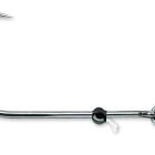 Pour bien rester ancré sur un plan horizontal, ce nez est équipé d’une quille en zinc sur sa partie basse. On retrouve donc cette grosse face avec deux yeux énormes et collés sur le bucktail qui renferme en partie inférieure un anneau de fixation afin d’y adjoindre l’armement sous la forme d’un bas de ligne pike rig. La face arrière est plate et équipée d’une grosse vis en tire bouchon sur laquelle une tige centreuse permettra de bien enfiler le leurre souple.
