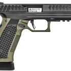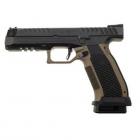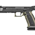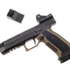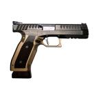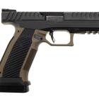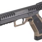 La carcasse de l’Alien est en acier afin de profiter d’un centre de gravité bas et d’un poids aidant à gérer le recul. Les couleurs noires et brunes forment un ensemble moderne soulignant le dessin futuriste de ce pistolet. Pas moins de 5 textures différentes co-existent au niveau de la poignée full frame afin d’assurer un grip sur. Les plaquettes en aluminium peuvent être échangées au profit de plaquettes accessoires de plus en plus présentes sur le marché de la personnalisation. Un Magwell est monté sur le bas de la poignée pour assurer la mise en place rapide du chargeur dans le puits.