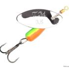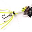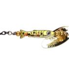 Le lest principal est en forme de poissonnet au décor très travaillé, sa forme comprimée latéralement lui permet de s’ancrer dans l’eau et ainsi offrir un profil réaliste de proie Certains des modèles sont réactifs aux UV avec soit un tag de couleur sur la partie lest ou des billes d’équilibrages orange fluorescent. Cette teinte peut décider les poissons boudeurs surtout aux extrémités de la journée ou par temps couvert. Equipée d’origine d’un émerillon rolling à l’ avant, elle vous permettra de passer du poisson nageur à la cuiller sans être obligé d’ ajouter un émerillon à votre agrafe. Pour terminer, la Larva Inline Spinner est équipée d’un hameçon triple Gamakatsu, modèle Treble 21 en taille 12, un hameçon de grande qualité au piquant exceptionnel en coloris black nickel pour plus de discrétion.