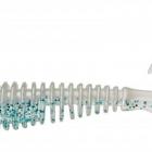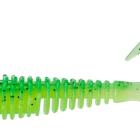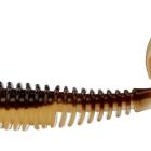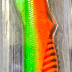 Cette caudale possède une armature qui se termine en pointe et un voile très souple se terminant par un renfort de matière pour accentuer le battement. On retrouve comme sur tous les leurres équipés du Sugar Belly Concept, un ventre où sont implantées des stries profondes et souples qui en plus de générer une perturbation aquatique seront un parfait support pour retenir un attractant en pâte. Le dos est plat et équipé d’une rainure facilitant un éventuel armement en texan. La tête est massive et à même de supporter tous les modèles de rétention des têtes plombées sans se déchirer. La nage est souple, discrète et fluide avec un voile qui ondule à la moindre traction. Ce leurre est parfumé avec un attractant à base huileuse et un parfum anis qui ne laisse pas d’odeur désagréable sur les mains.