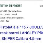 Tout comme son petit frère le pistolet à air comprimé Langley Silencer de BO Manufacture, ce modèle porte le nom de la base de Langley (BO Manufacture baptise toutes ses armes avec des noms de bases militaires !) est proposée en deux puissances de 10 et 13,7 joules. C'est beaucoup pour une arme de poing ! La plupart des modèles de pistolets avoisinent les 2 à 3 joules seulement. Avec cette puissance plus importante il sera possible de tirer plus loin et surement plus précisément !