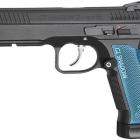 Avec ses plaquettes de crosse bleue il est facile de reconnaitre ce pistolet CO2 CZ 75 Shadow 2 d'ASG. C'est la réplique de l'arme de tir sportif très utilisée sur les pas de tir, notamment en TSV en ce moment. Cette réplique fonctionne avec une capsule de CO2 de 12 g. Une bonne partie de la carcasse est confectionnée en métal ce qui lui donne une fière allure et un poids proche du vrai pistolet de tir. La glissière est confectionnée en aluminium anodisée ce qui donne des angles plus vifs et moins arrondis qu'une carcasse en polymère. Les stries de surface de la glissière offrent une bonne prise en main pour armer le pistolet.