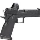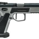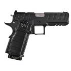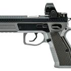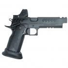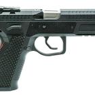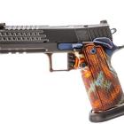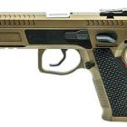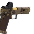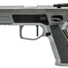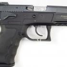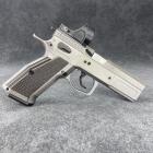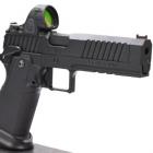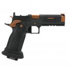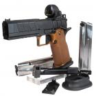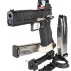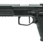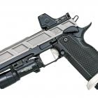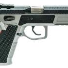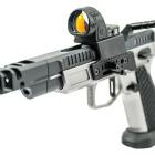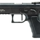 Ce modèle joue sur le côté bicolore de sa finition pour sortir du lot de la production de ce type de pistolet. Les plaquettes de crosse en aluminium noir sont structurées en surface et offrent une bonne adhérence dans la paume de la main. La longue queue de castor à l’arrière de la carcasse permet de chausser l’arme rapidement et efficacement. Le mécanisme fonctionne en simple et double action et le chargeur comporte 17 cartouches. Les commandes, arrêtoirs de glissière, de chargeur et de sureté, sont bien proportionnées et offrent un gain de temps appréciable en tir sportif de vitesse.