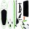 planches SUP gonflables Vert et blancCe stand up paddle est idéal pour le surf ou la promenade et la pratique en eau vive grâce à son confort et sa stabilité. Doté de valves spéciales à vis haute pression, il est facile et rapide à gonfler et à dégonfler. Deux ailerons préfixés et un aileron amovible sont durables pour résister aux pressions du pagayage. Un sac de transport pratique est inclus pour un transport facile et rapide. Notre planche SUP est conçue avec un niveau de courbe parfait, ce qui augmente sa rigidité pour une conduite plus stable. Cette planche glisse sans effort dans les eaux plates et glisse en douceur dans les vagues. La planche SUP gonflable est résistante aux perforations et aux UV et résiste aux conditions nautiques extrêmes. Veuillez noter que ceci est conçu pour les adultes. GPSR