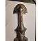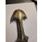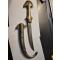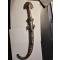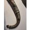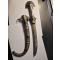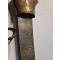 poignard africain, KOUMMIA marocain, fourreau en laiton et en matière ressemblant à de l'argent, 2 cabochons pyramidaux sur la poignée et 3 sur le fourreau , déco pastilles peinture bicolore rouge et verte, 4 chiffres "8" martelés sur la lame, lame double tranchant, longueur totale 39 cm, longueur de la lame seule 21 cm. (Objet N° 4)