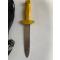 modèle de couteau de nageurs de combat de Toulon en dotation jusqu'au début des années 60 . Lame crantée d'un côté . manche peint en jaune et présence de l'anneau en caoutchouc d'origine . Complet vintage .