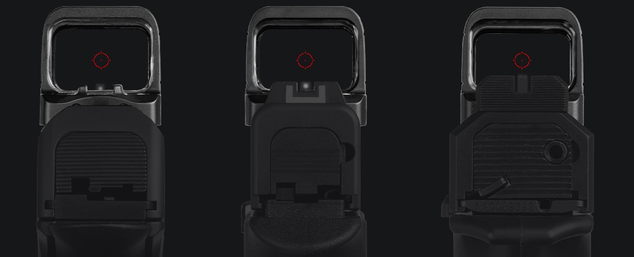 Une hausse est également intégrée à l’arrière de l’optique qui peut être utilisé sur les pistolets dont la hausse pourrait être masqué par le point rouge ou ceux qui nécessitent son retrait pour installer une optique.
