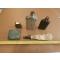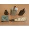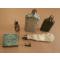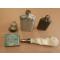 une poire a plomb le cuir est encore souple mais il y a un petit trou , petite felure sur le godet doseur . petits bidons de poudre et une petite reserve a amorces en laiton une copie je crois