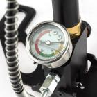 Les carabines PCP ou air pré comprimé ont le vent en poupe en France, enfin dirons-nous ! Ces armes PCP sont fiables, précises et très agréables à utiliser avec leur chargeur multi coups. Mais pour pressuriser le cylindre à 200 bars environ il faut soit un compresseur dédié à cet effet et encore un peu cher soit alors une simple pompe manuelle. Gamo qui étend sa gamme de carabine PCP, avec l’Arrow notamment propose donc aussi une pompe à un tarif intéressant. Toute de rouge vêtue cette pompe manuelle est équipée de deux solides poignées offrant une bonne prise en main, de deux patins permettant de bien immobiliser la pompe avec vos pieds et d’un solide flexible qu’il faut raccorder à la prise de l’arme. Le manomètre intégré vous indique la pression interne du cylindre.