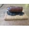 Joli presse papiers ( 170mm X 90 mm X 85 mm) Plaque de marbre rosatre marqué "NAMUR" sur la tranche présentant un gros éclat d'obus surmonté d'une représentation d'un obus en marbre griotte rouge avec deux ceintures de forcement peintes en vert et la date 1914 au cul de l'ogive. Beau souvenir du début de la guerre de 14 en Belgique.