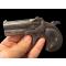 excellent derringer remingtonnmodele tardif. fabrication UMC. 2 coups calibre 41 rimfire. reste de bleu brillant sur canon le reste virant tabac. excellent canon. OREILLES NON FENDUES. une plaquette avec un fêlé est réparée. très bel état général.
