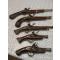 Répliques de 5 pistolets en laiton et bois (ne tirent pas mais s'amorcent), sur support en bois rouge, époque Napoléon 1er, année 1800