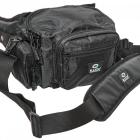 Sur la face ventrale nous retrouvons un compartiment principal de rangement pour boîtes à leurres et accessoires avec fermeture zippée et ouverture à soufflets permettant de prévenir la chute d'objets et comprenant divers poches et filets de rangements pour petits accessoires dont une petite pochette étanche amovible. Cette fermeture est surmontée de deux cordons ressorts extensibles auxquels vous pouvez fixer petite paire de ciseaux, mini pince à anneaux brisés, coupe-fil…