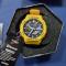 La nouvelle Casio G-Shock GA-B2100C-9AER va beaucoup vous plaire avec son design jaune. En effet, son boîtier est résine renforcé en fibre de carbone de couleur jaune. C'est une couleur pétillante et solaire qui vous accompagnera lors de vos sorties sportives. Grâce à son étanchéité de 20 ATM, vous pourrez aller nager, et même faire de la plongée avec. Il s'agit de la norme ISO 22810. De plus, ce modèle solaire connectée, vous offre un grand nombre de fonctionnalité que vous pourrez découvrir grâce aux 4 boutons poussoirs qui se trouvent de part et d'autre du boîtier. De plus, son boîtier est très léger, il fait 52 grammes. Au niveau de ses dimensions, il fait 45.5 mm de largeur, 48.6 mm de hauteur et 11.9 mm d'épaisseur. Les dimensions s'adapteront et habilleront parfaitement à un poignet masculin. Le cadran de la montre est surplombé par un verre minéral qui permet d'assurer la parfaite sécurité et d'éviter les rayures ou les chocs. Pour finir, son fond de boîte est maintenu par des vis. Le Cadran Cette Casio G-Shock vous propose un cadran rond au fond noir qui arbore un grand nombre de fonctions que vous pourrez découvrir au fur et à mesure de votre utilisation. Vous retrouverez tout d'abord un affichage analogique traditionnel avec deux aiguilles qui vous donneront les heures et les minutes et elles sont grises et blanches. Elles viennent alors désigner douze index qui vous serviront de repères pour les heures et ils sont représentés par des bâtons gris. On peut aussi remarquer qu'un discret chemin de fer se dessine en couleur noire pour vous donner les minutes de façon plus précise. Ensuite, vous avez un affichage numérique présent en bas à droite du cadran. Grâce à la fonction Super Illuminator, vous pourrez éclairer le cadran de votre montre pour une meilleure lisibilité à toute heure de la journée. Enfin, la marque vient signer sa montre à 12 heures. Les Fonctions - Bluetooth® Smart : la montre est équipée d'une technologie Bluetooth® économe en énergie permettant l'échange de données d'une simple pression sur un bouton. La fonction Bluetooth® permet de connecter sans fil la montre à un smartphone, donnant ainsi accès à une multitude de fonctionnalités très pratiques. - Smartphone time : si l'horloge est couplé au smartphone, le temps est réglé automatiquement et afficher l'heure actuelle si le monde entier. - Super Illuminator : par simple pression de bouton le cadran sera éclairé de belles couleurs à la mode. - Résistance aux chocs : la structure résistante aux chocs protège la montre contre les impacts et les vibrations. - Revêtement Neobrite : les aiguilles et/ou l'index ont un revêtement fluorescent et continuent à briller dans l'obscurité lorsque la montre a été exposée auparavant à une source lumineuse. - Fonction d'heure universelle : la fonction d'heure universelle affiche l'heure dans 29 fuseaux horaires et grandes villes du monde. - Chronomètre 1/100 s - 24 heures : mesure le temps écoulé avec une précision au 1/100ème de seconde sur une durée maximale de 24 heures. Le signal sonore confirme le lancement et l'arrêt du chronomètre. - Comptes à rebours - 1/1 sec - 24 heures : pour tous ceux qui aiment la précision : les comptes à rebours vous rappellent les évènements importants ou récurrents en émettant un signal acoustique à la date et l'heure réglées. Le temps peut être programmé en secondes, 24 heures maximum à l'avance. - 5 alarmes quotidiennes : une alarme sonore vous rappelle quotidiennement vos échéances à l'heure programmée. Ce modèle dispose de cinq alarmes indépendantes pour vous rappeler en toute flexibilité vos rendez-vous importants. - Marche/Arrêt bip sonore des touches : le bip sonore des touches peut être désactivé avec la touche de mode. Après la désactivation, il n'y a plus de bip sonore au passage d'une fonction à l'autre. Les alarmes ou comptes à rebours programmés restent cependant actifs après la désactivation du bip sonore des touches.