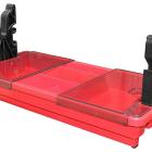 La partie supérieure de la boîte, dont l’ouverture s’effectue par deux loquets à clipser, reçoit les petits éléments. À l’intérieur, deux petits plateaux à plusieurs compartiments dédiés aux petits outils sont déposables et cachent d’autres rangements de toute taille.