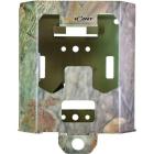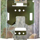 Il est confectionné dans un polymère très solide, coloris marron sur la partie avant et noir à l'arrière. Les moulages de surface lui donnent du volume et du coup le fondent un peu contre l'écorce d'un arbre. La face avant pivote vers la gauche à l'ouverture. Elle est maintenue en place grâce à une solide fermeture . Il y a un vrai système de passe câble à l'arrière du boitier afin de le sécuriser sur un poteau ou un arbre. Des trous sur chaque partie permettent de fixer un cadenas pour sécuriser ce boitier et éviter qu'un intrus ne vole la carte. La face arrière comporte le logement des piles. Deux pattes servent à clipser l'arrière du boitier contre la sangle et le support. Un pas de vis (Trépied standard de 1/4"-20) en dessous du boitier permet une fixation par barre métallique vissée dans l'arbre. C'est encore plus discret qu'avec une sangle !